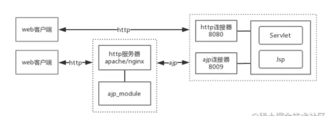 AJP:Apache JServ 协议(AJP)是一种二进制协议,专门代理从 Web 服务器到位于后端的应用 程序服务器的入站请求