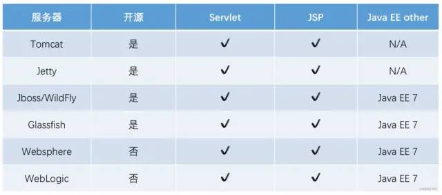 上图对比了 Java EE 容器的实现情况,Tomcat 和 Jetty 都只提供了 Java Web 容器必需的 Servlet 和 JSP 规范,开发者要想实现其他的功能,需要自己依赖其他开源实现。