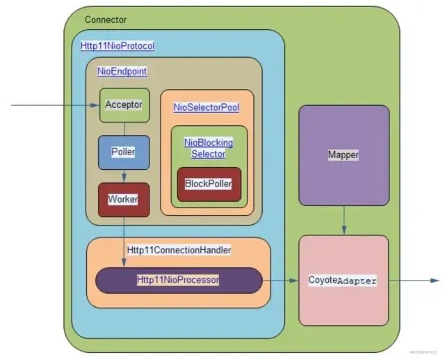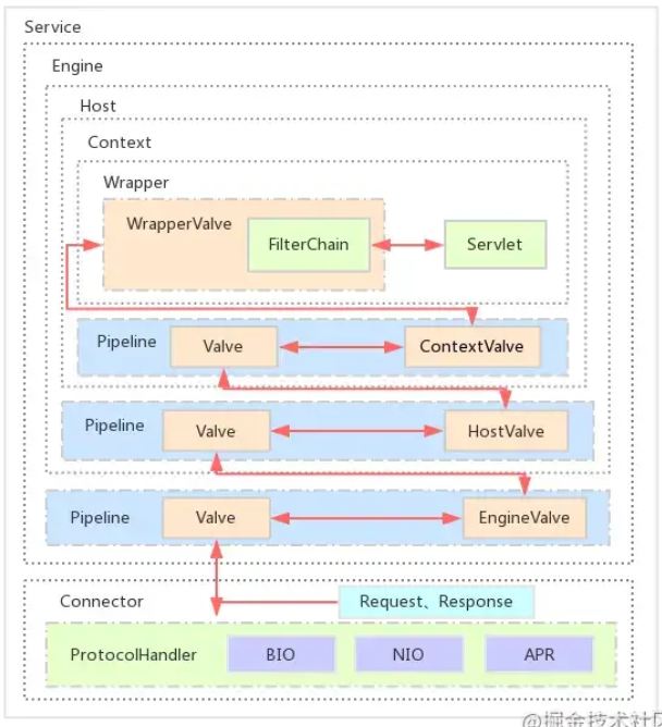 CoyoteAdapter是Connector到Container的适配器,Http11NioProcessor调用其提供的service方法,内部创建Request和Response对象,并调用最顶层容器的Pipeline中的第一个Valve的invoke方法