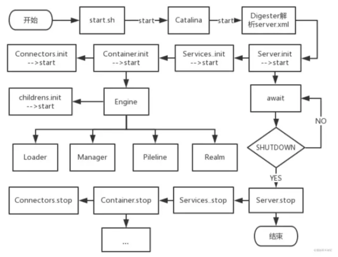 按照 xml 的配置关系,server 的子元素是 service,service 的子元素是顶层容器 Engine,每层容器有持有自己的子容器,而这些元素都实现了生命周期管理 的各个方法,因此就很容易的完成整个容器的启动、关闭等生命周期的管理。