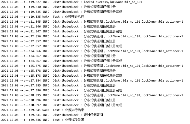 可以看到,定时任务一共延期了6次,最后一次注册成功了,但是业务执行完随着解锁任务取消了。