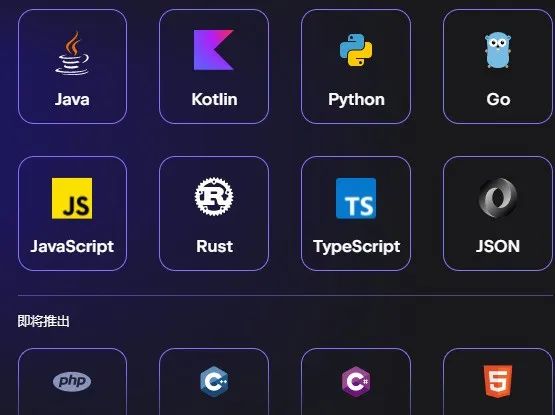 目前支持Java、Kotlin、python、Go等后端主流语言,同时会在后续版本中适配PHP、C++、C#和HTML,对我们Java开发者来说,目前的编程语言支持度已经完全够用了。