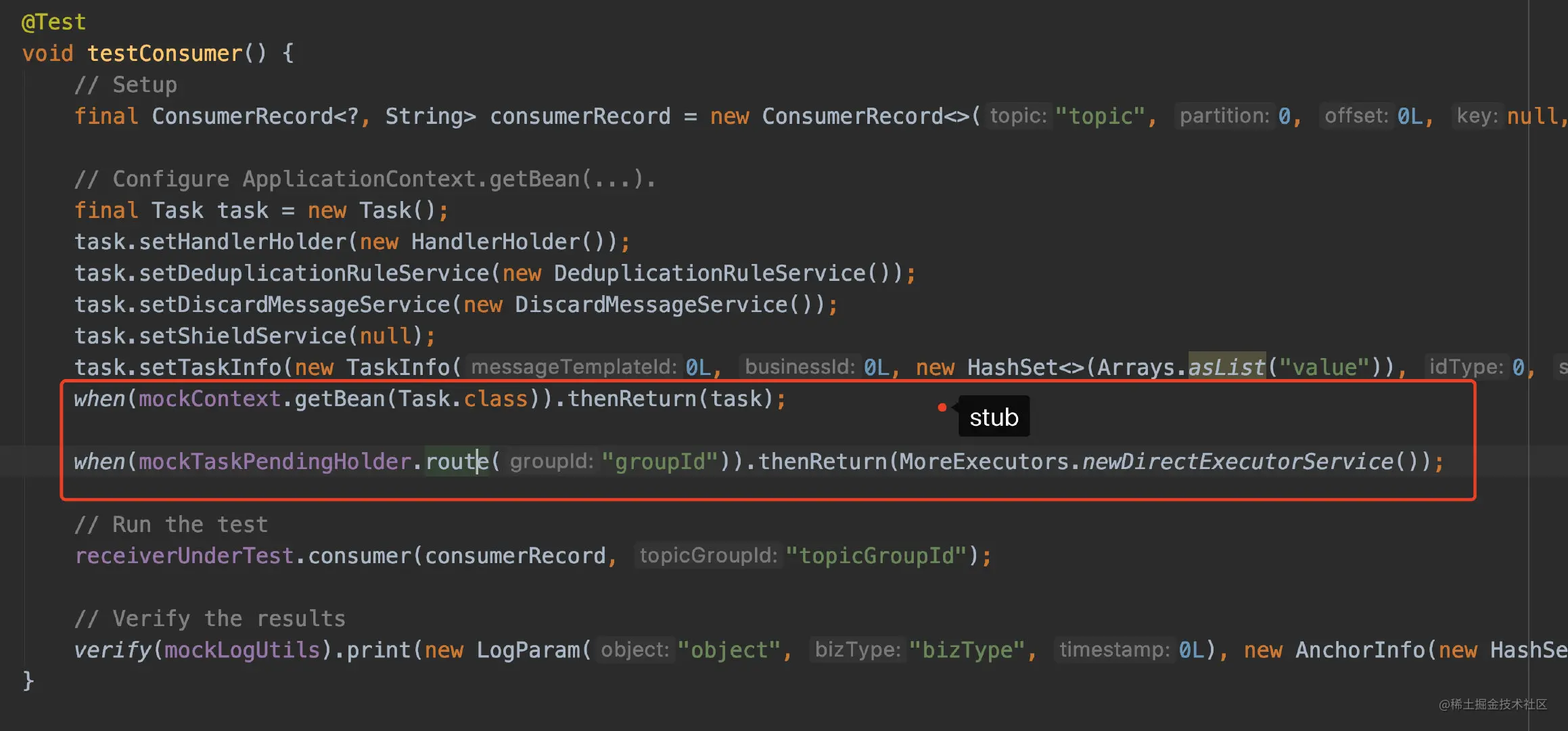 所以我会假定调用dao层的某方法时它的返回值是什么,这个过程就是Stub