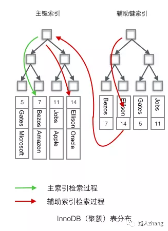 B+树的索引又可以分为主索引和辅助索引。其中主索引为聚簇索引,辅助索引为非聚簇索引。聚簇索引是以主键作为B+ 树索引的键值所构成的B+树索引,聚簇索引的叶子节点存储着完整的数据记录;非聚簇索引是以非主键的列作为B+树索引的键值所构成的B+树索引,非聚簇索引的叶子节点存储着主键值。所以使用非聚簇索引进行查询时,会先找到主键值,然后到根据聚簇索引找到主键对应的数据域。上图中叶子节点存储的是数据记录,为聚簇索引的结构图,非聚簇索引的结构图如下:
