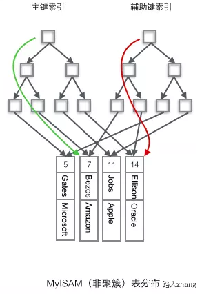 在MyISAM存储引擎中,默认的索引也是B+树索引,但主索引和辅助索引都是非聚簇索引,也就是说索引结构的叶子节点存储的都是一个指向数据行的地址。并且使用辅助索引检索无需访问主键的索引。
