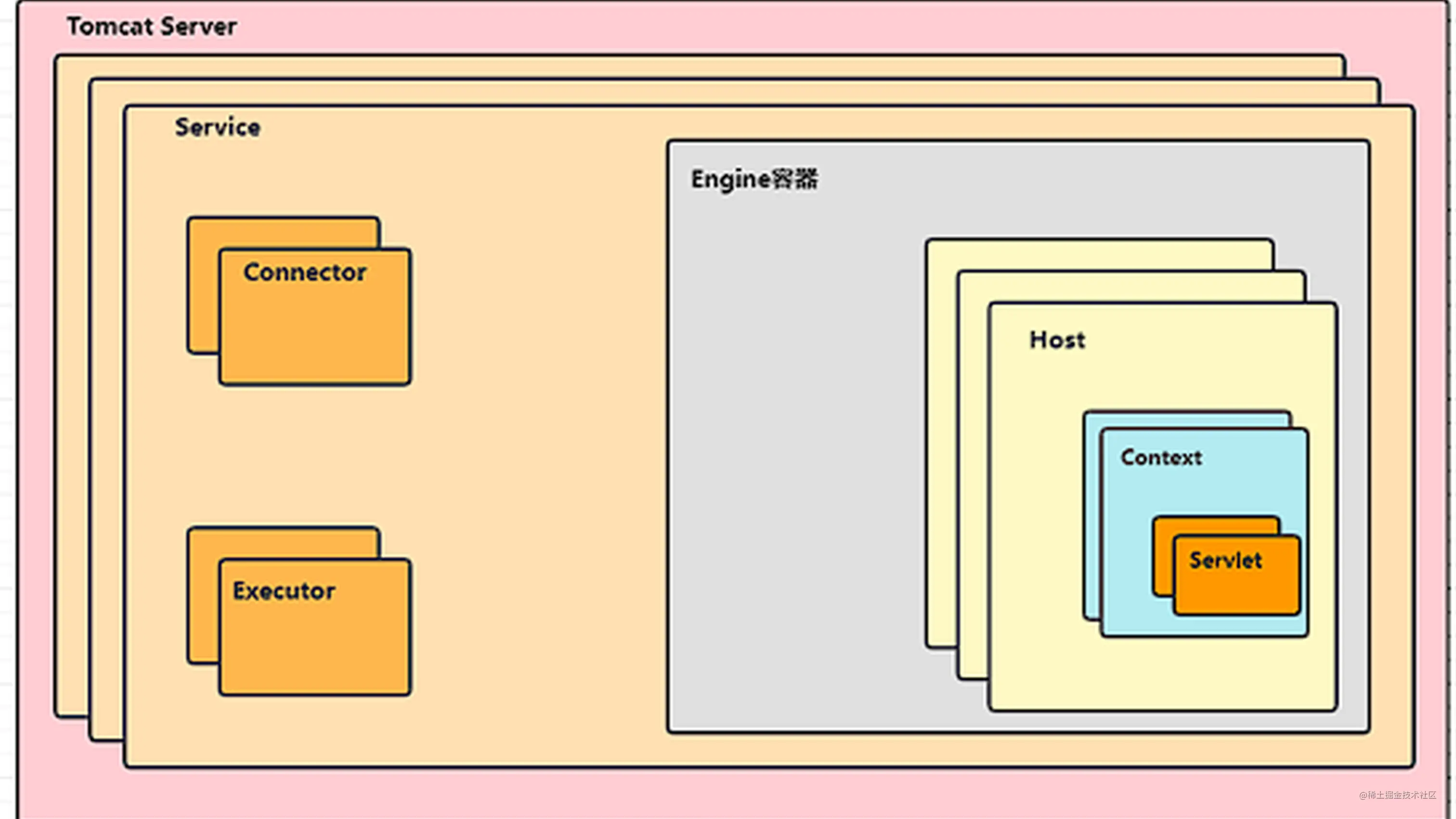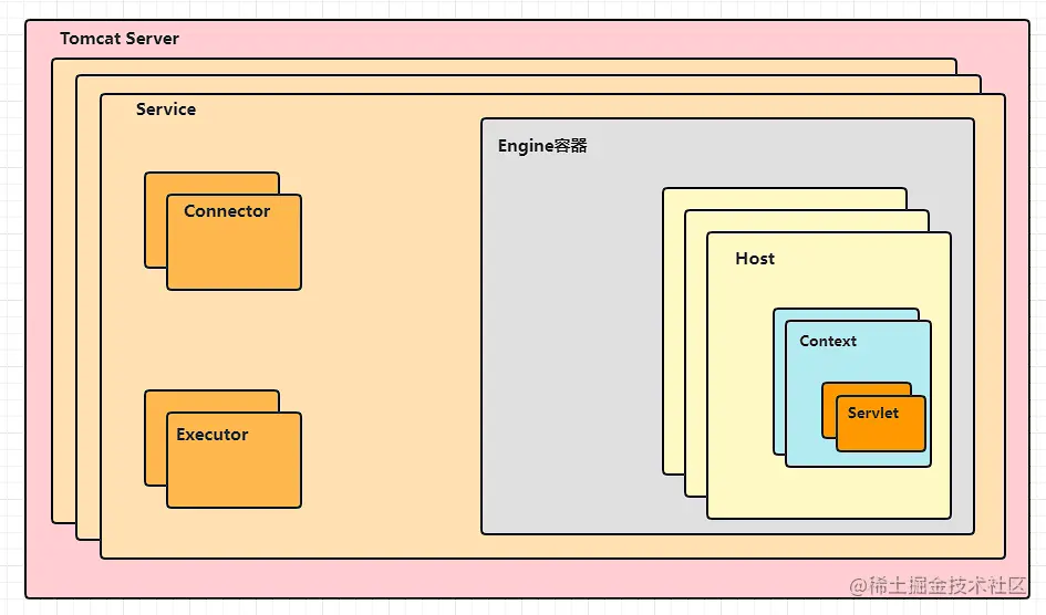 每一个Service组件都包含了多个Connector和Executor。Connector的作用就是负责处理客户端的连接请求,Executor水白了就是线程池,负责处理Service内所有组件的任务。 一个Server包含多个Service,一个Service中有多个连接器和一个Engine容器。连接器和容器之间是通过ServletRequest、ServletResponse通信交互数据。