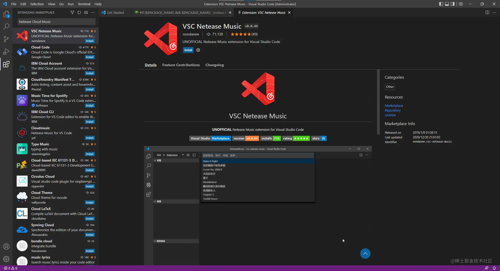 最近惊奇的发现,网易云音乐也提供了VSCode插件,有兴趣的同学可以安装试试。
