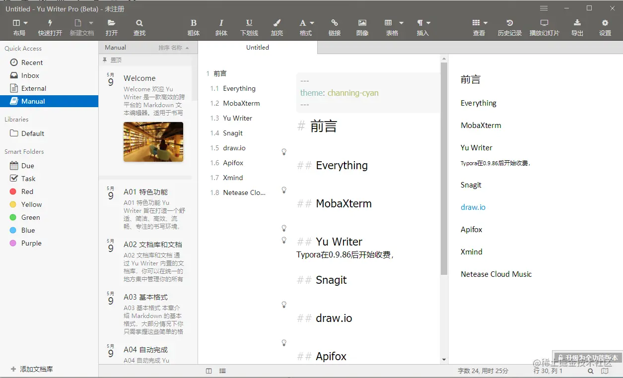 Yu Writer,个人觉得是一款可以完全替代Typora的MarkDown编辑器。Yu Writer的高级功能是需要注册的,但是免费的基本功能基本已经满足对于文档编写的需求,比如实时预览、目录管理等。本人编写的文档基本如无特殊需求,都在使用Yu Writer编写。支持Windows、Mac、Linux操作系统。