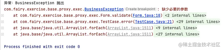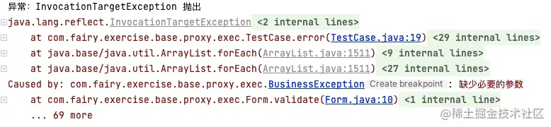 通过输出发现,业务中抛出的业务异常,被包装成了 InvocationTargetException 异常,也就是说,被 InvocationTargetException 给吞了,原来结在这里。