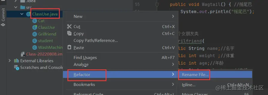 右击要更改的文件,选中Refactor,再选中Rename File... 修改完后,点击Refactor确认修改。
