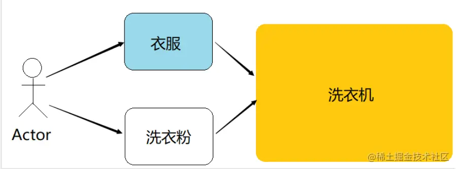 - 只需要将衣服放进洗衣机,导入洗衣粉,启动开关即可,通过对象之间的交互来完成的。