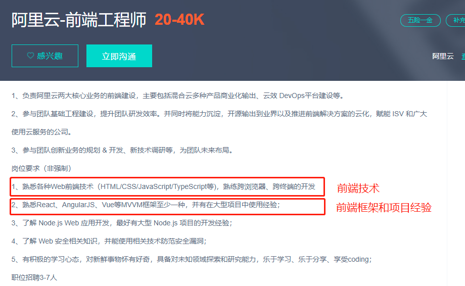 以薪资高,好入门的前端岗位为例,阿里云对应届生的要求是熟练掌握前端技术,熟悉前端框架,并具有相关项目经验:
