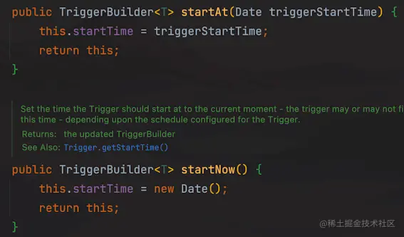 上面这段代码中,将触发器设为startNow,也就是立即执行。也可以使用startAt以及endAt方法设置开始时间以及结束时间等。
