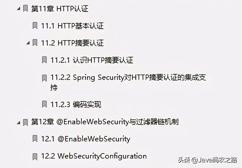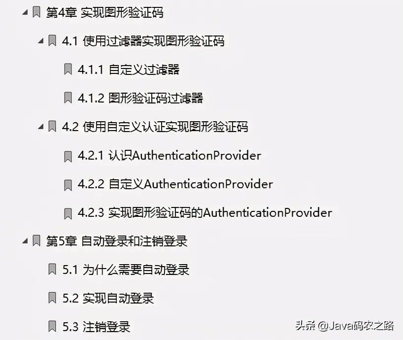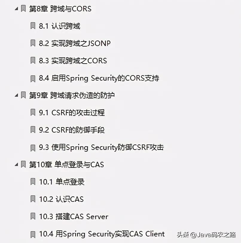 而上面这份文档基于以上问题,整理出了一套由浅入深的学习路径,不仅可以带你掌握 Spring Security 框架的全局,还从实战角度出发,帮助你高效掌握基于 Spring Security 框架的系统安全性设计方法和开发技巧。