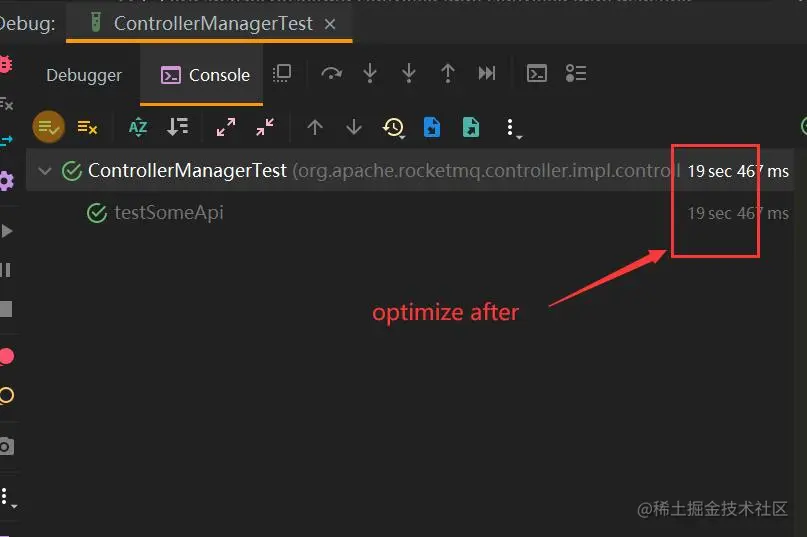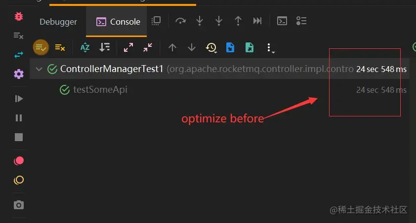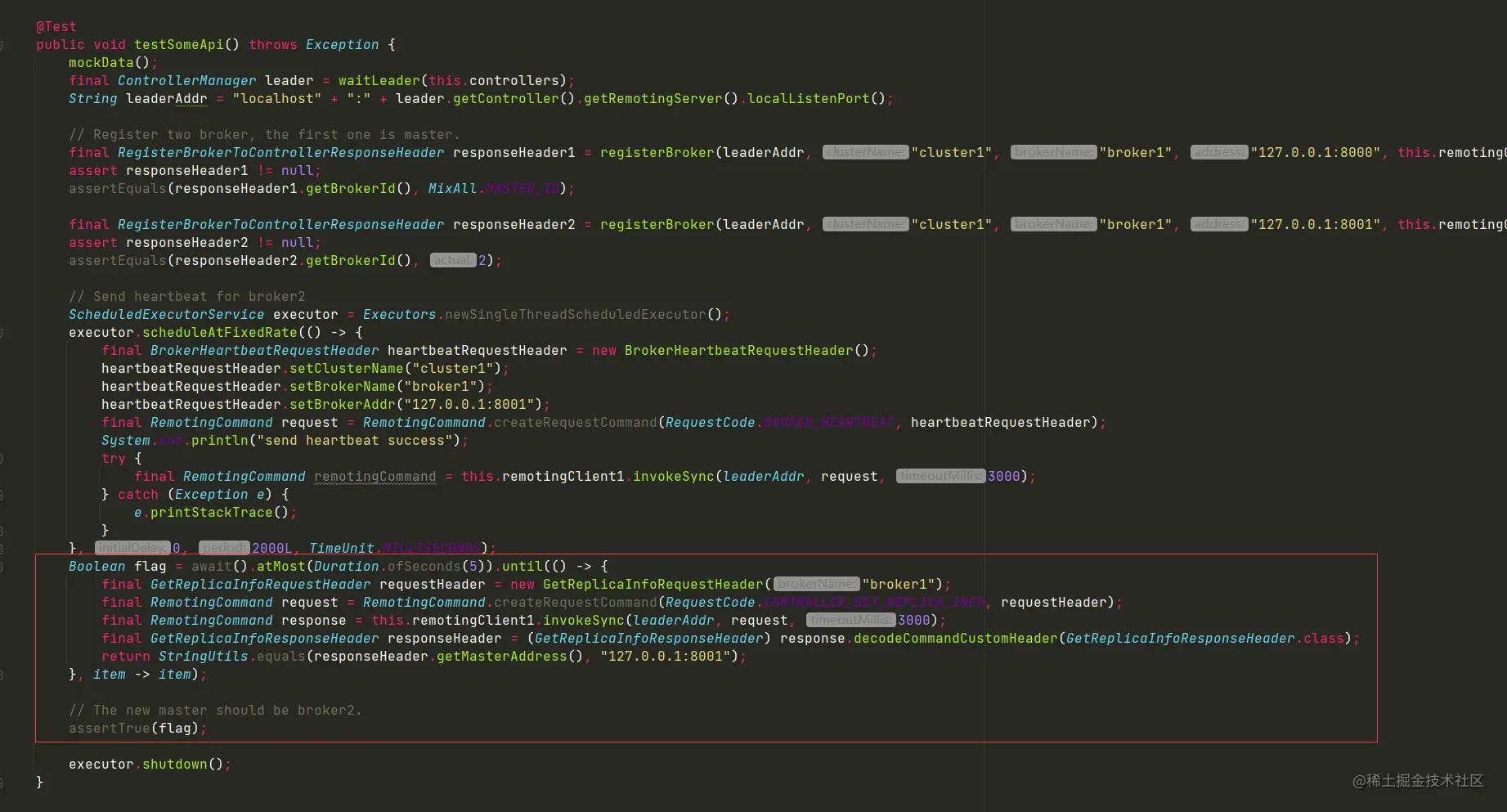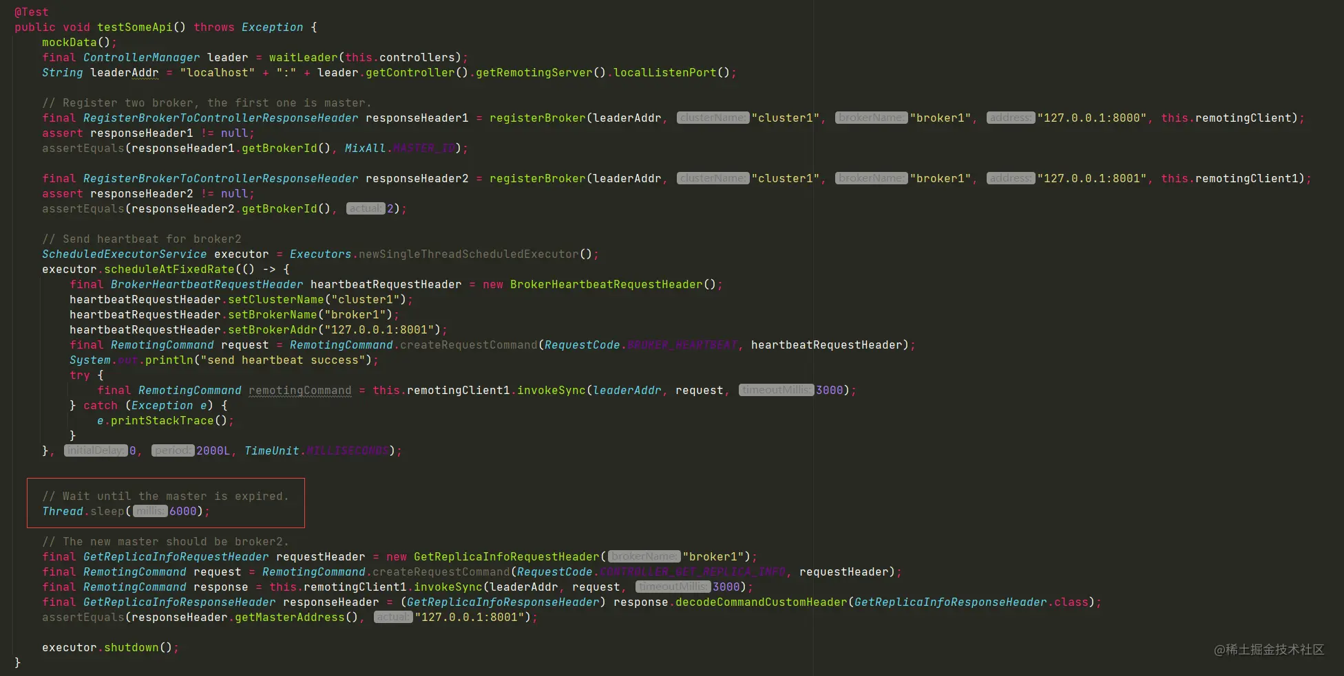 在RocketMQ的test cases 中有一些使用了 Thread.sleep,接下来我们看看如何使用awaitility进行优化,减少测试用例的执行时间。以ControllerManagerTest测试用例为例子来解决,在代码中可以看到有这样的代码: