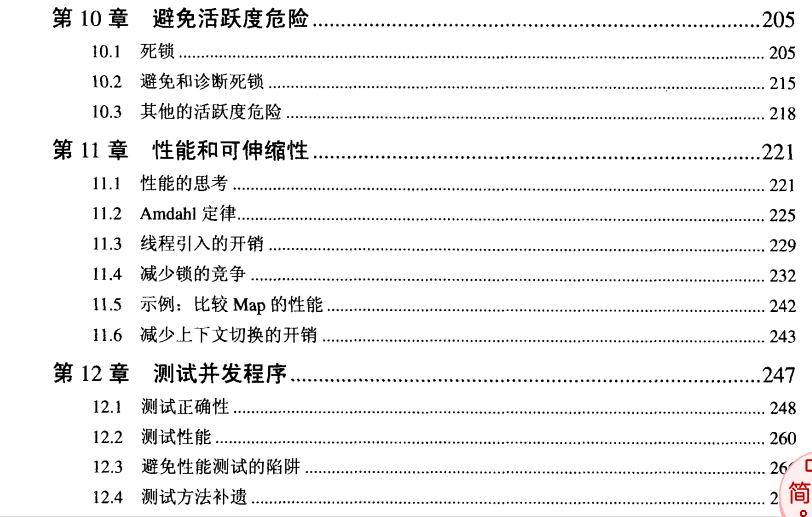 第10~12章:涉及并发程序自身。要确保并发程序执行了你所希望它做的事情,且性能是可以接受的。