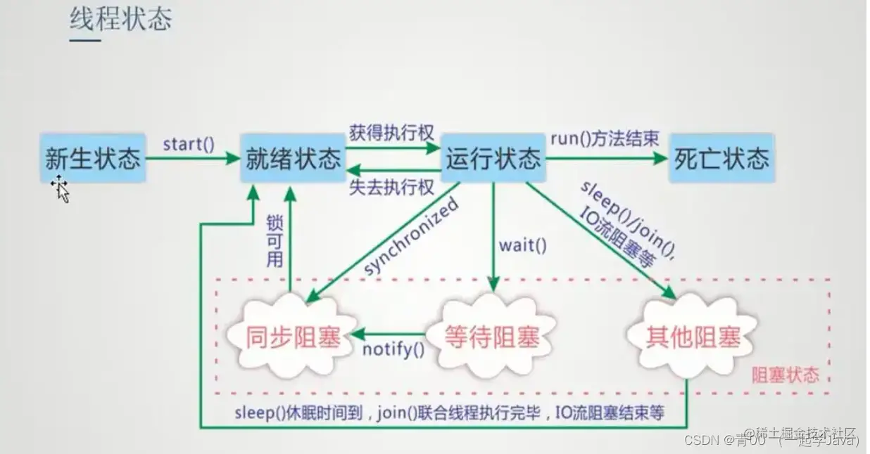 线程除创建状态 New 和结束状态 Terminate 外,主要有以下几种运行状态:
