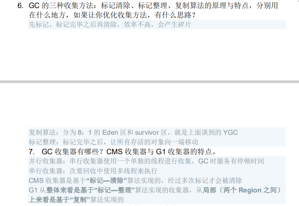 - 6. GC 的三种收集方法:标记清除、标记整理、复制算法的原理与特点,分别用 在什么地方,如果让你优化收集方法,有什么思路?