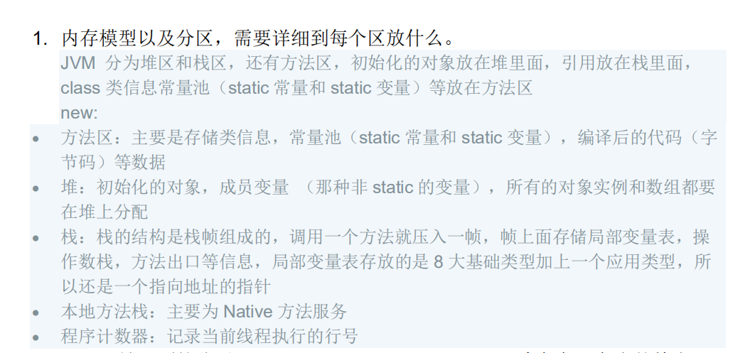 - 1. 内存模型以及分区,需要详细到每个区放什么。
