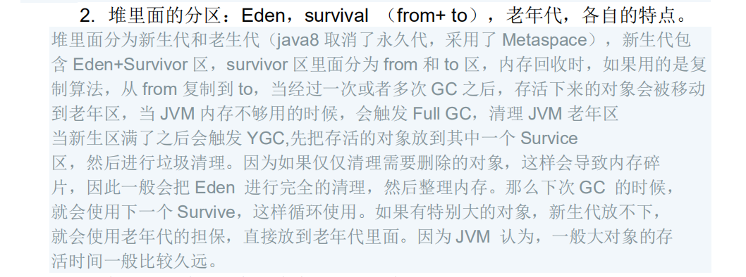 - 2. 堆里面的分区:Eden,survival (from+ to),老年代,各自的特点。