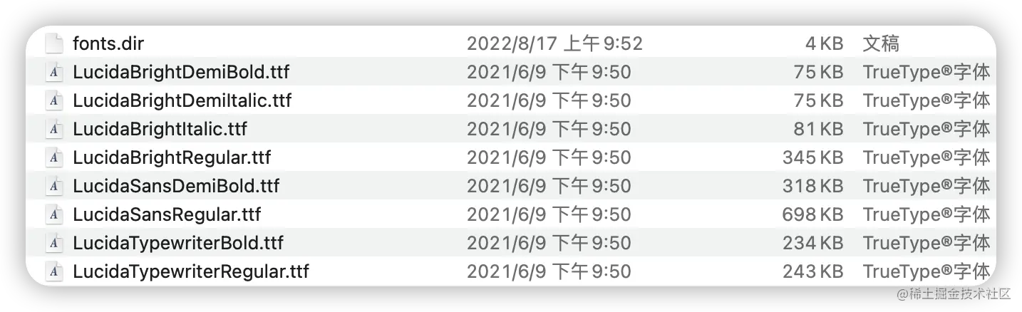 查看本机 JDK 安装目录,在 /jre/lib/fonts 目录下有 Lucida 字体。