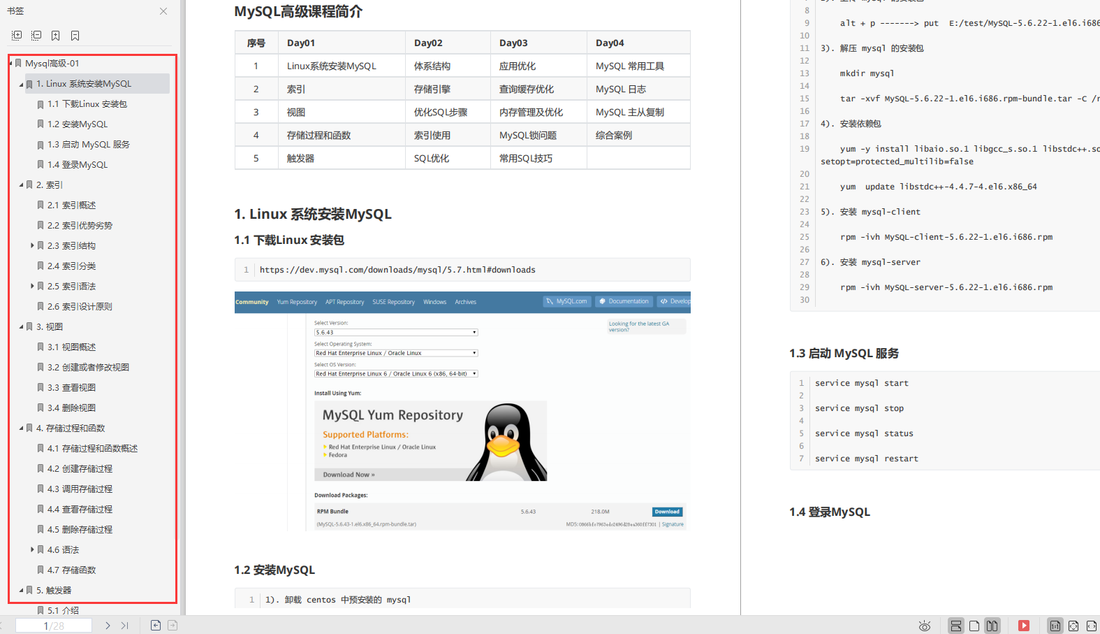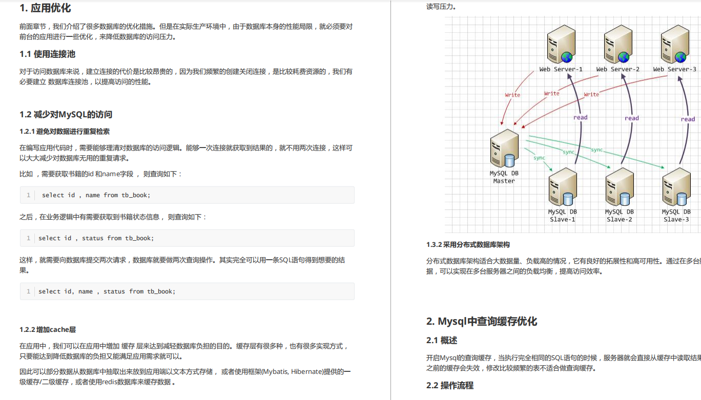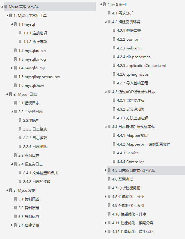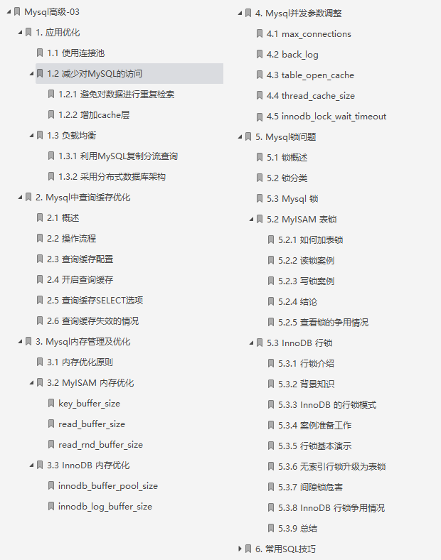 本笔记主要讲解了MySQL中的视图/存储过程/触发器/索引等对象的使用、常见的SQL语句优化的技巧、应用优化、数据库优化、数据库日志等方面的知识,并通过综合案例,对笔记中的知识进行一个整合应用。旨在通过MySQL高级部分内容,可以在满足现有业务需求基础上,对MySQL底层的体系结构, 对底层的优化有一个深入的理解 , 对系统的整体性能进行提升。
