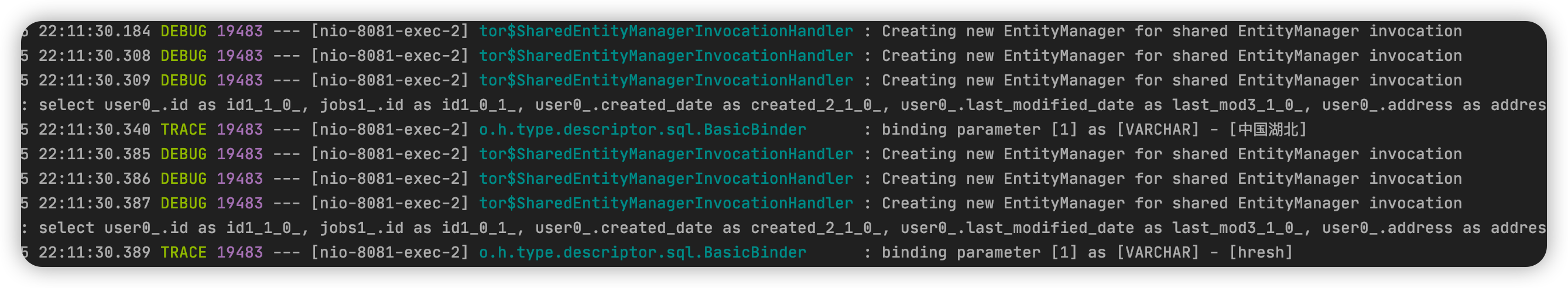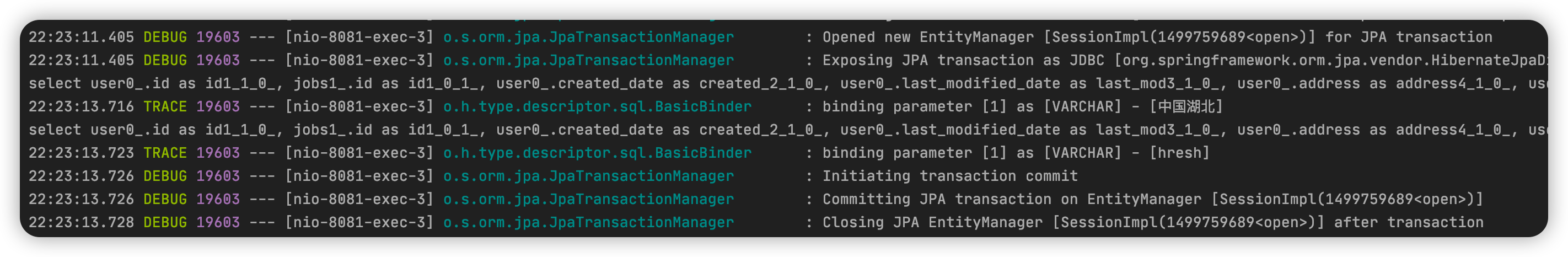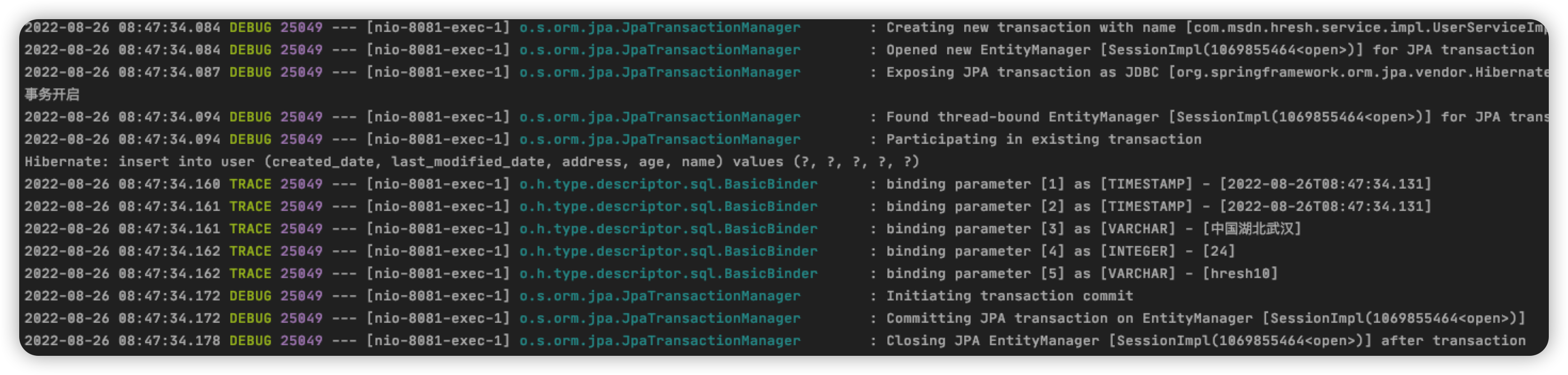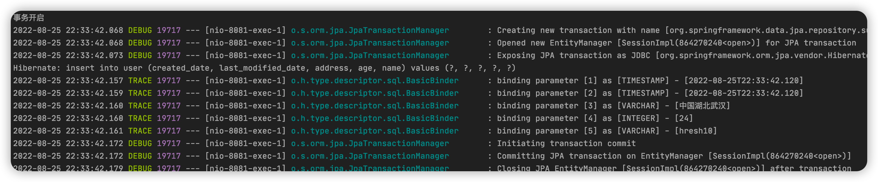 根据上述代码可知,findByAddress()方法没有配置事务,而 query()方法配置了事务,日志输出如下:
