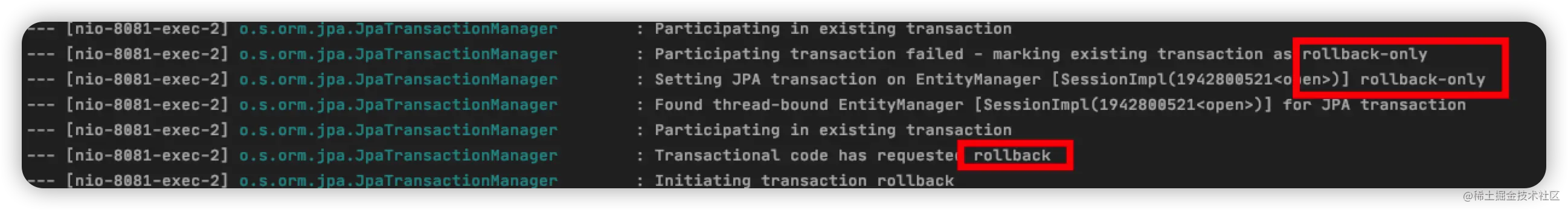 如果类A的方法a()调用方法b(),方法a()、b()都配置了事务,那么又是什么结果呢?我们只需在 findByAddress()方法加上 @Transactional 注解,重新执行代码,结果如下: