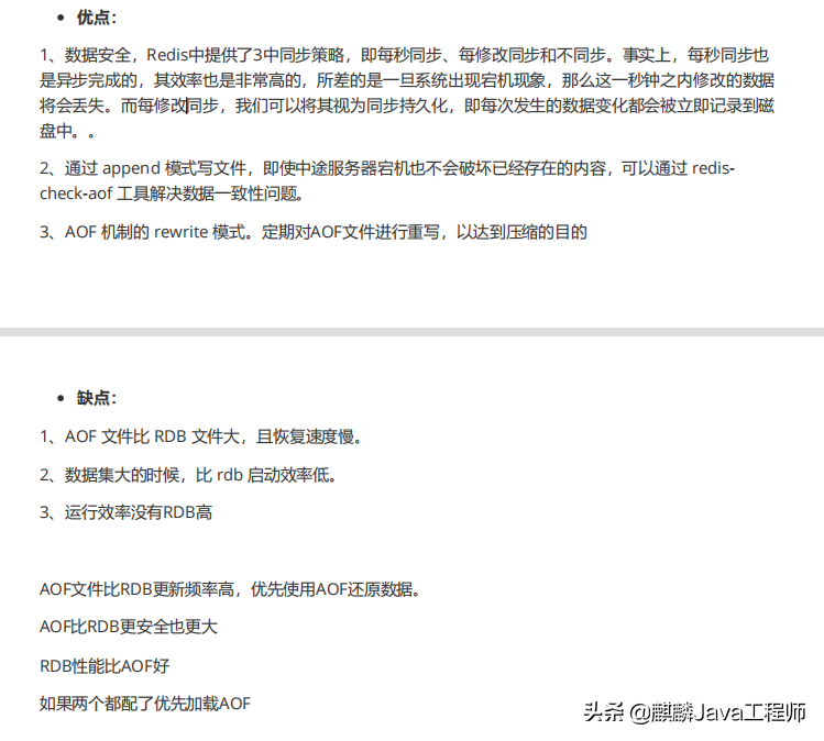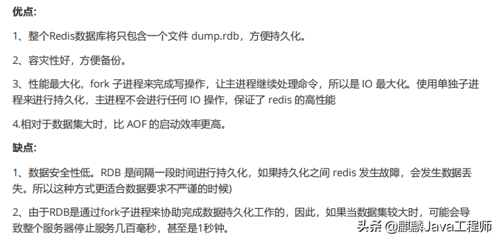 RDB:在指定的时间间隔内将内存中的数据集快照写入磁盘,实际操作过程是fork一个子进程,先将数据集写入临时文件,写入成功后,再替换之前的文件,用二进制压缩存储。