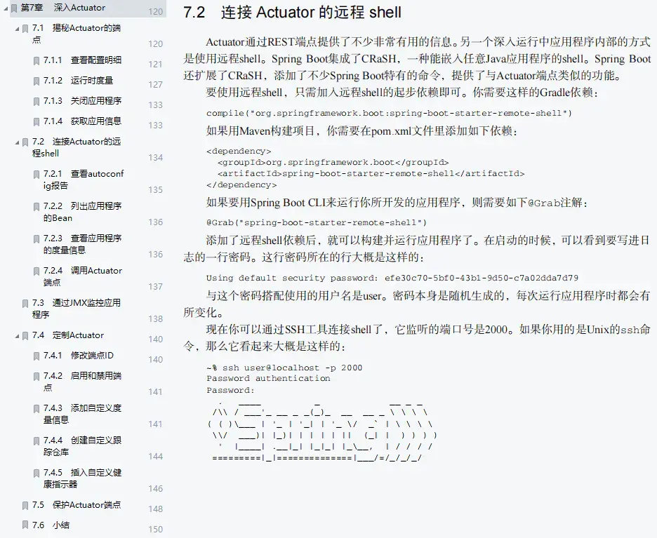 内容涵盖:(Actuator Web端点 + 调整Actuator + 通过shell连入运行中的应用程序 + 保护Actuator)