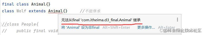- 这里先是定义了一个Animal动物类,并且在其类前加上了final关键字