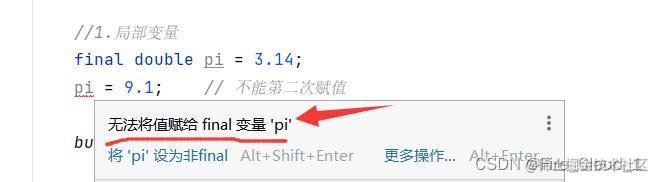 - 这里的方法形参也是一样,如果定义成用final关键字修饰,那一定是不可以在方法体中对其进行赋值的,==因为你在调用这个方法的时候系统会让你一定要传入参数==