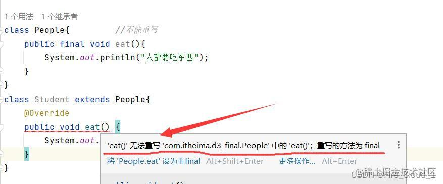 - 这里要注意,我并没有拿final关键字去修饰这个类,==因此是可以被继承的==,但是我们这个类中的eat()方法前加了一个final关键字,接着就定义一个Teacher老师类去继承它