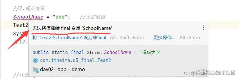 - 好,我们先来看一下这个,在这个Test2类中,声明了一个静态成员变量,一个实例成员变量,都用final关键字对其进行了一个修饰,而且都有了一个初始值