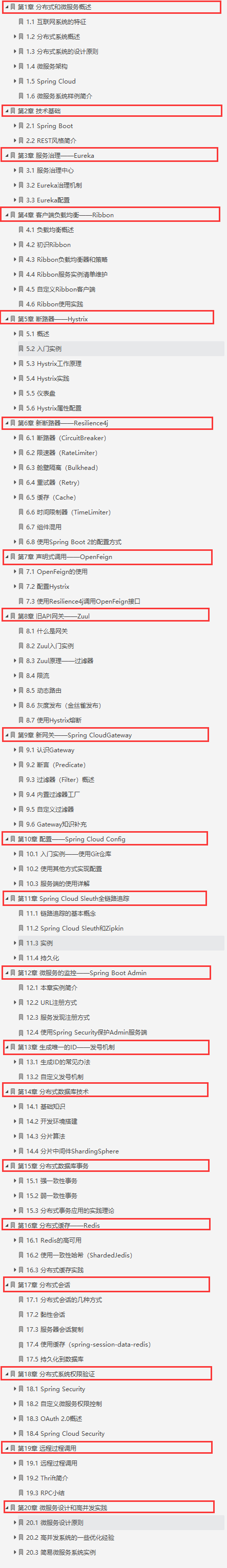 第二部分介绍Spring Cloud的各类组件,这是微服务的核心内容。介绍的组件包括服务注册和服务发现(Eureka)、服务调用(Ribbon 和OpenFeign)、断路器(Hystrix 和Resilience4j)、网关(Zuul 和Gateway)、配置(Config)、全链路追踪(Sleuth)、 微服务的监控(Admin)等。