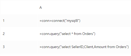 | 2 | =db.query@1("select sum(Amount) from sales where sellerID=? and year(OrderDate)=? and month(OrderDate)=?", p_SellerID,year(now()),month(now())) | /查询当月销售额 | |