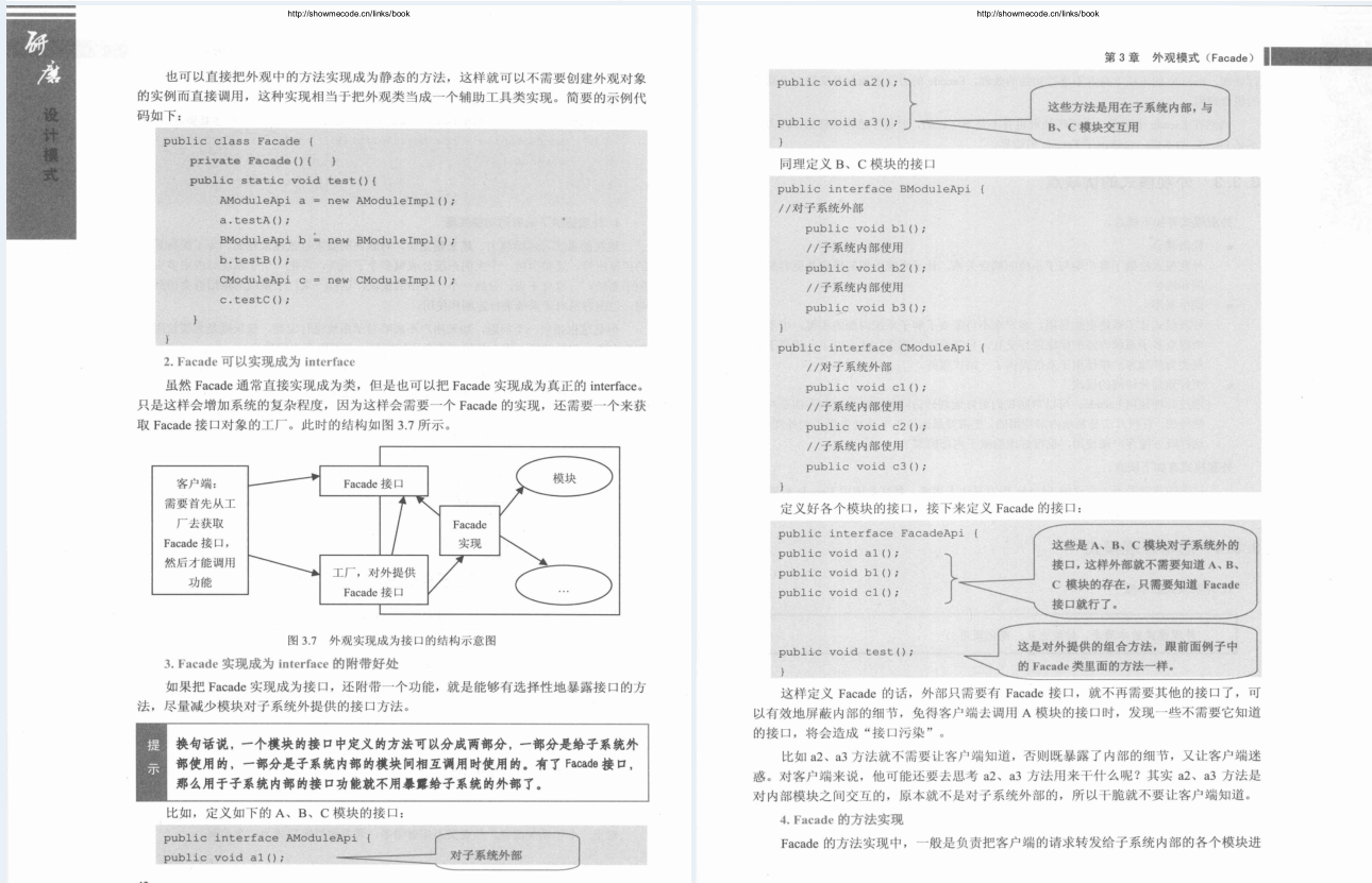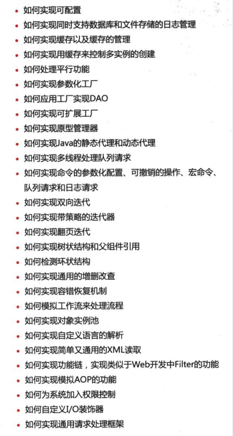 这里给大家推荐一份完整覆盖GoF讲述的23个设计模式并加以细细研磨的文档。初级内容从基本讲起,包括每个模式的定义、功能、思路、结构、基本实现、运行调用顺序、基本应用示例等,让读者能系统、完整、准确地掌握每个模式,培养正确的“设计观”;中高级内容则深入探讨如何理解这些模式,包括模式中蕴涵什么样的设计思想,模式的本质是什么,模式如何结合实际应用,模式的优缺点以及与其他模式的关系等,以期让读者尽量去理解和掌握每个设计模式的精髓所在。
