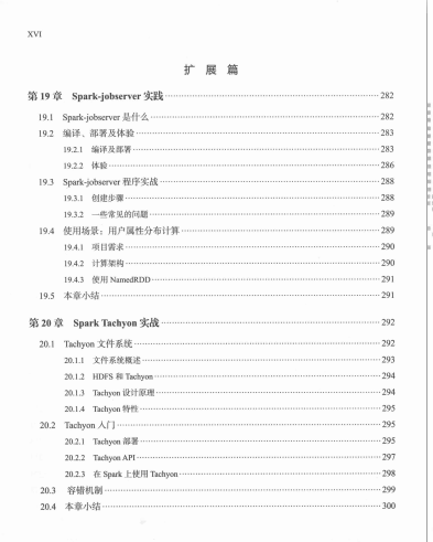 - 扩展篇(第19 ~ 20章):介绍Jobserver和Tachyon在Spark上的使用情况。