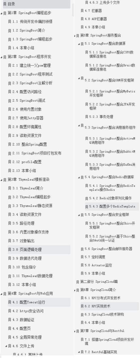 Spring Boot、Thymeleaf、Jetty、Redis 整合、C3P0 整合、Druid 整合、MyBatis 整合、ActiveMQ 整合、RabbitMQ 整合、Kafka 整合、Shiro 整合、SpringDataJPA整合、Mail整合、Actuator监控、Restful 、RestTemplatc、Eureka、Ribbon 、 Feign 、Hystrix 、Turbinc,Zuul、SpringCloudConfig、SpringCloudBus 、SpringCloudStream、SpringCloudSleuth、Zipkin、OAuth、RabbitMQ和 Docker。