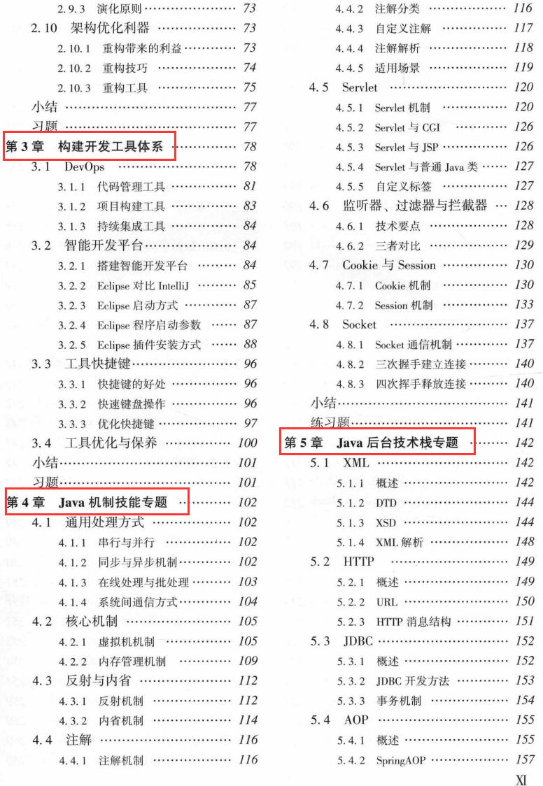 第二部分包括第3~5章,介绍了架构师必备的工具体系、Java机制技能要点专题、Java 后台技术栈技能要点专题以及Java八大核心架构设计体系,为软件架构设计的高级技能体系;