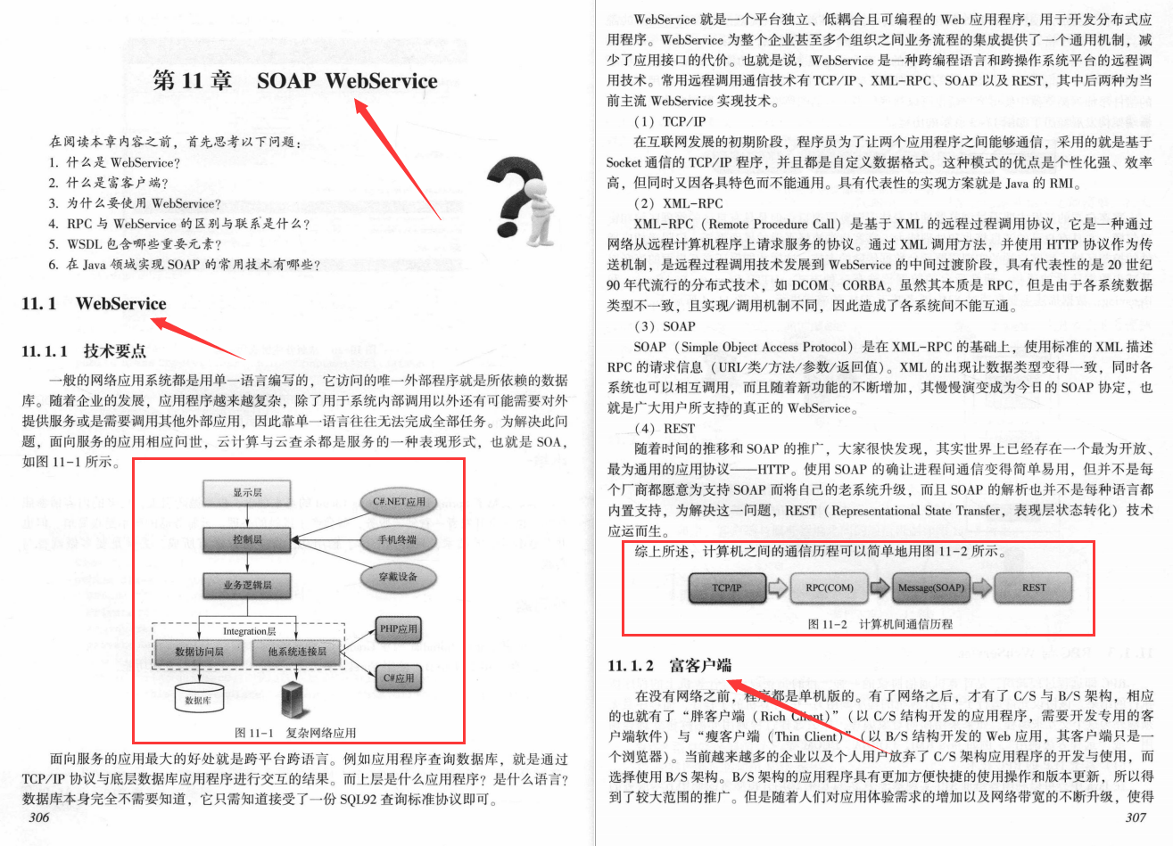 第11章对SOAPWebService技术进行了系统的介绍,需要重点掌握SOAP原理以及WSDL各部分组成内容。具体实现案例请参照本章练习题与课后解答。理解好理论之后,可进行实际代码的编写,编写完成之后,再对照理论进行分析总结,这样就会更好地认识与掌握原理与实现的技术细节。