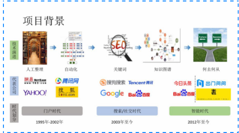 ①门户时代:1995~2002年,主要代表公司:Yahoo、网易、搜狐、腾讯。互联网初期,因为数据较少,因此需要一个内容聚合的地方,人们才能够快速的找到信息。因此,门户通过"内容类型"对内容进行整理,然后以频道页形式满足用户需求。因为数据少,初期由人工对新闻进行分类。随着数据的增多,靠人工分类已经变得不现实,因此各大公司纷纷引入分类技术,自动化文本分类。此后,文本分类技术发展迅速。