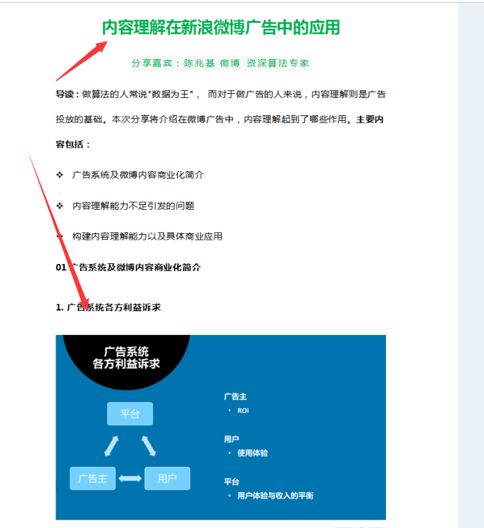 导读:做算法的人常说"数据为王",而对于做广告的人来说,内容理解则是广告投放的基础。本次分享将介绍在微博广告中,内容理解起到了哪些作用。主要内容包括: