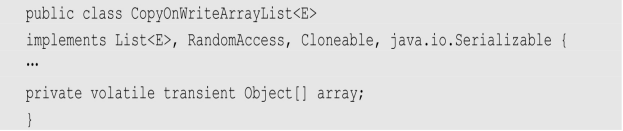 和ArrayList一样,CopyOnWriteArrayList的核心数据结构也是一个数组,代码如下。