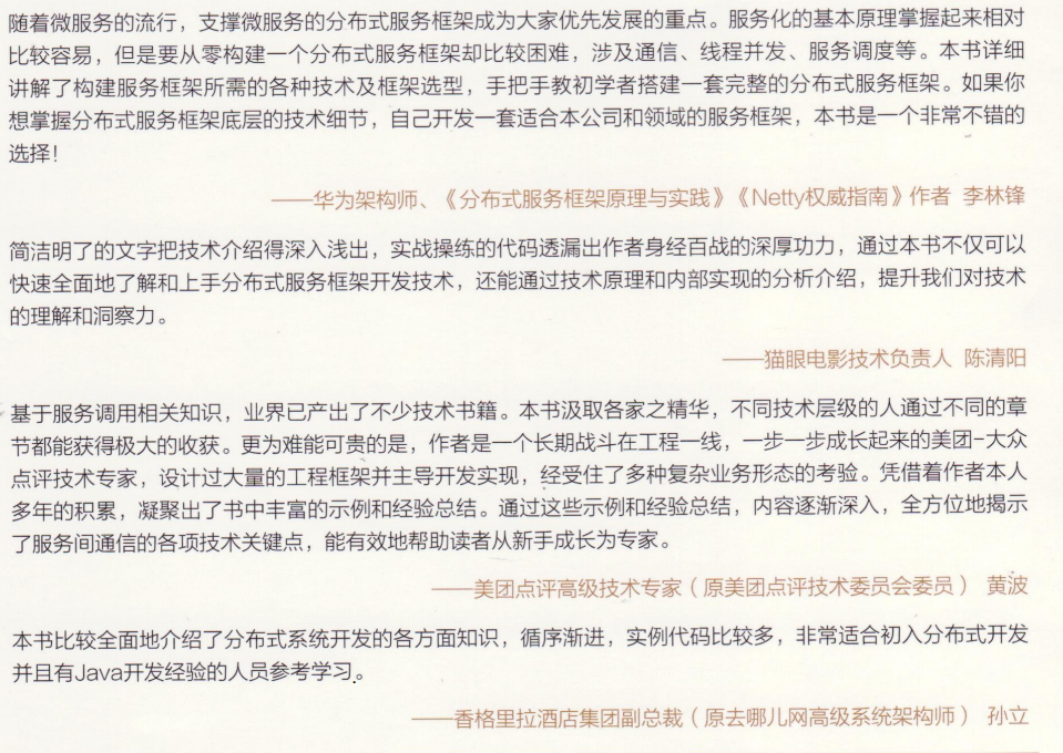 从专家的角度就可以看出来,本篇是非常适合大家来学习的,读完本篇之后,希望读者可以完整地了解实现一个分布式服务框架的所有技术细节和实现原理,希望对想了解分布式服务框架实现细节的读者有所启发和帮助。