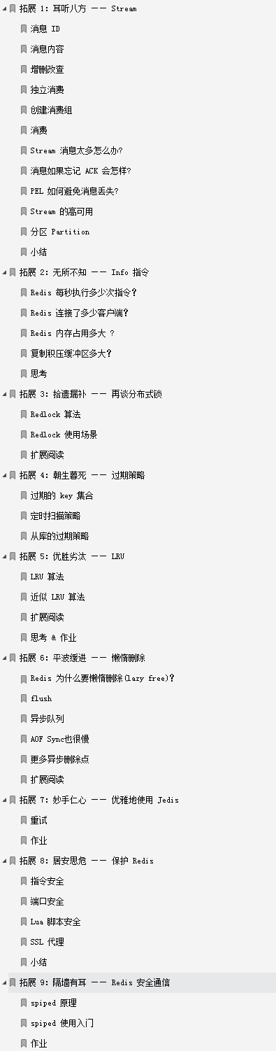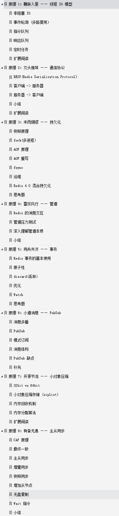 本小册主要讲解实战中摸索总结的Redis最常用最核心知识点,但限于篇幅和精力,并没有涵盖Redis 全部的内容知识点,比如Redis 内置的lua 脚本引擎就完全没有提到。之所以不讲,是因为在平时的工作中确实从来没有使用过,它就好比关系数据库的存储过程,虽然功能很强大,但是确实很少使用,而且也不易维护,所以就不推荐读者使用了。下面我们就从这基础、应用、原理、集群、拓展、源码等六个篇章来贯通redis深度笔记吧
