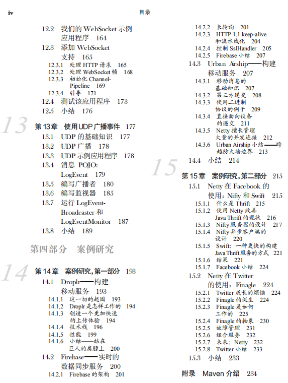 第四部分是一些案例研究,包含了Droplr、Firebase、 Urban Airship 、Facebook 和 Twitter 提交的案例研究,演示了Netty 的设计以及架构原则,在构建高度可伸缩和可扩展的应用程序方面的应用: