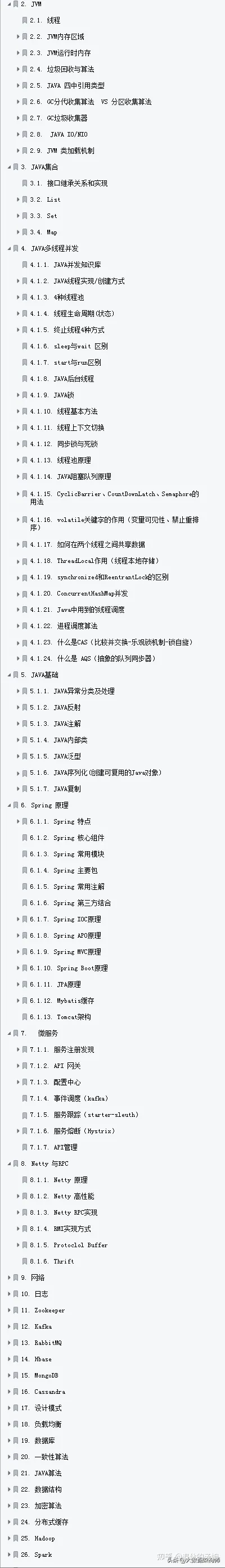 这份手册匆匆一看就感觉非常牛X,里面包含了:JVM、多线程并发、JAVA基础、Spring 原理、微服务、Netty、网络、Zookeeper、Kafka、RabbitMQ、设计模式、负载均衡、数据库、一致性算法、数据结构、加密算法、分布式缓存、Hadoop、机器学习、云计算等29个知识点;