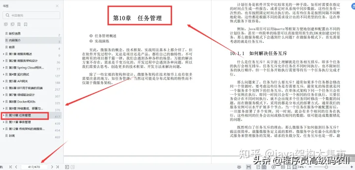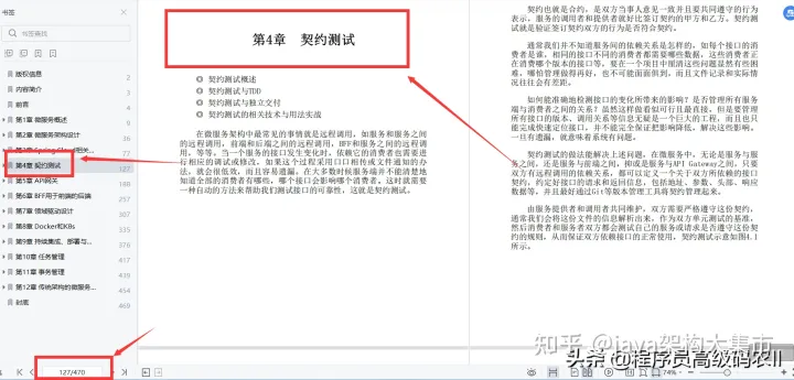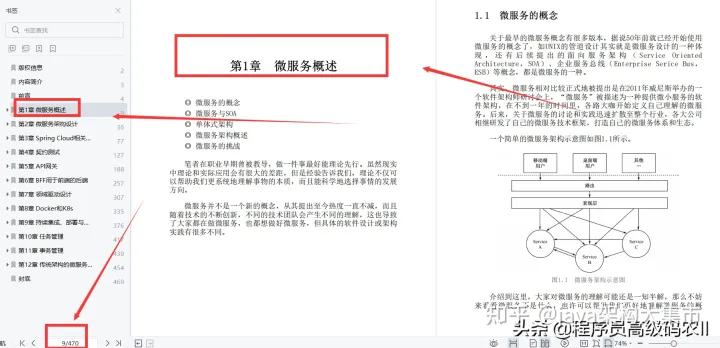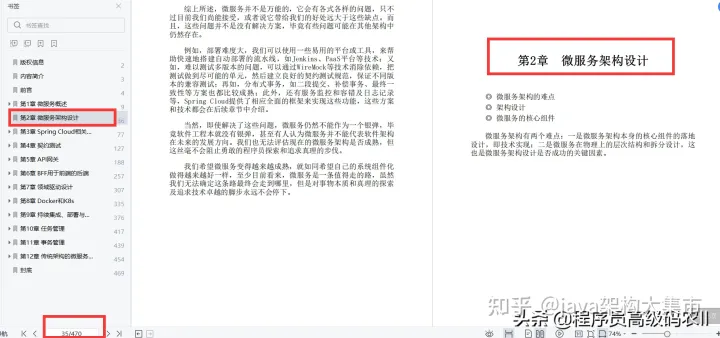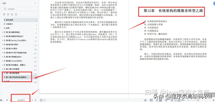 本文总共有470页,包含12章的内容,微服务概述微服务架构设计、Spring Cloud相关组件、契约测试、API网关、BFF用于前端的后端领域驱动设计、Docker和K8s、持续集成、部署与交付、任务管理、事务管理、传统架构的微服务转型之路。
