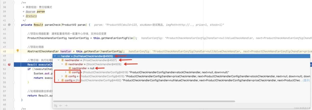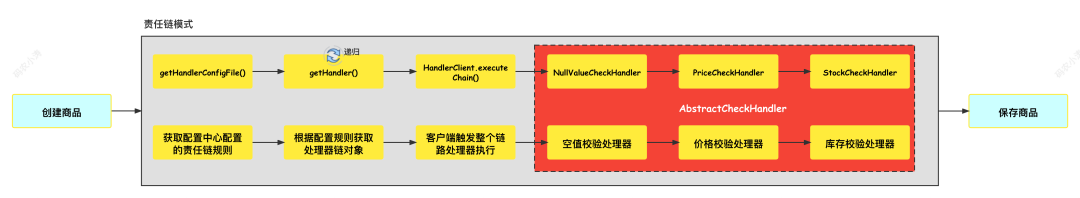实际上,getHandler()获取处理器对象的代码就是把在配置中心配置的规则ConfigJson,转换成配置类ProductCheckHandlerConfig对象,再根据配置类对象,转换成实际的处理器对象,这个处理器对象持有整个链路的调用顺序。